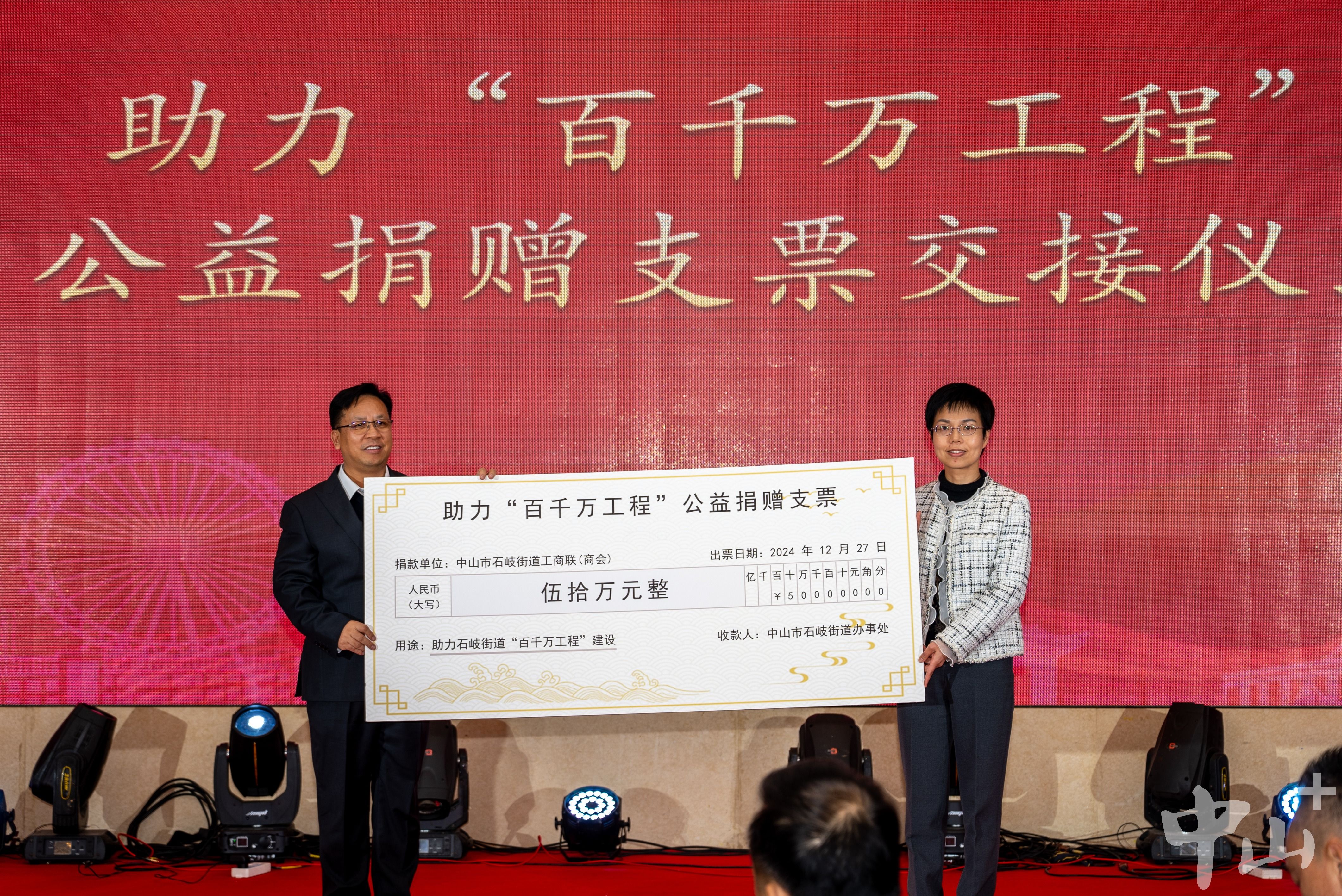 12月27日晚,中山市石岐工商聯(商會)第八屆執委會(理事會)就職典禮暨24周年晚會拉開帷幕。活動邀請石岐街道各行各業的企業家超400人共聚一堂,并舉行了授信儀式和助力“百千萬工程”支票交接儀式。