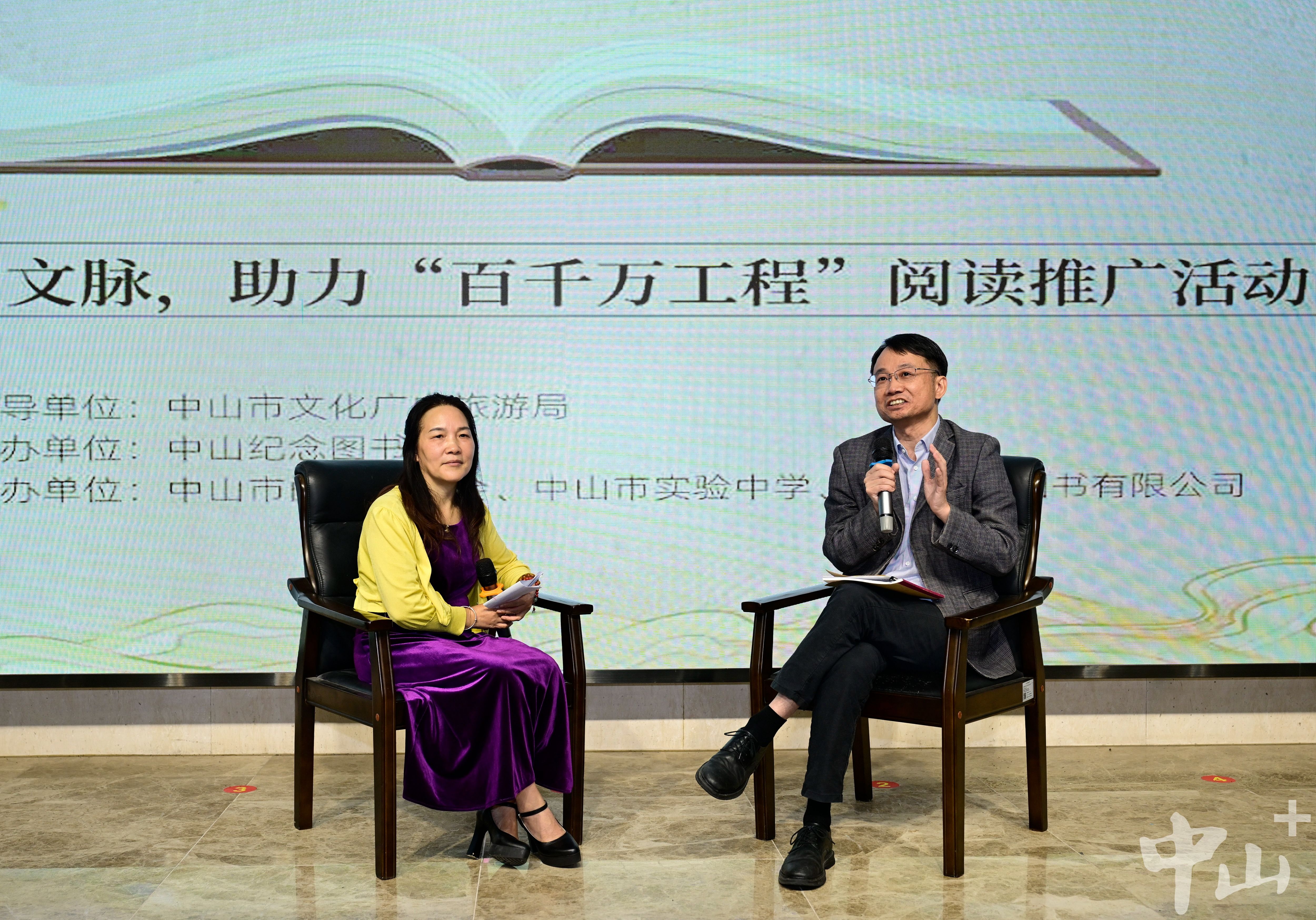在主題分享后,黃祖悅與中山市閱讀促進會副會長、暨南大學歷史學博士、中山紀念圖書館鄉村領讀人馬偉明展開一場精彩對談。圍繞“王云五精神的當代價值”主題,兩位嘉賓從歷史視角與教育實踐出發,探討了王云五先生“知識普及”理念在鄉村振興與青少年教育中的現實意義。