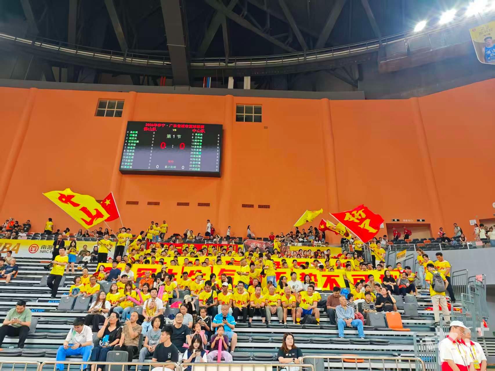 觀眾席上,球迷正陸續(xù)有序入場就座。除了佛山主場球迷外,統(tǒng)一身著黃色應(yīng)援T恤的中山遠征球迷格外醒目,他們高舉印有“同飲一江水,籃球競風流”“牛氣沖天,勢不可擋”的標語,用整齊劃一的吶喊,為客場作戰(zhàn)的中山隊助威。