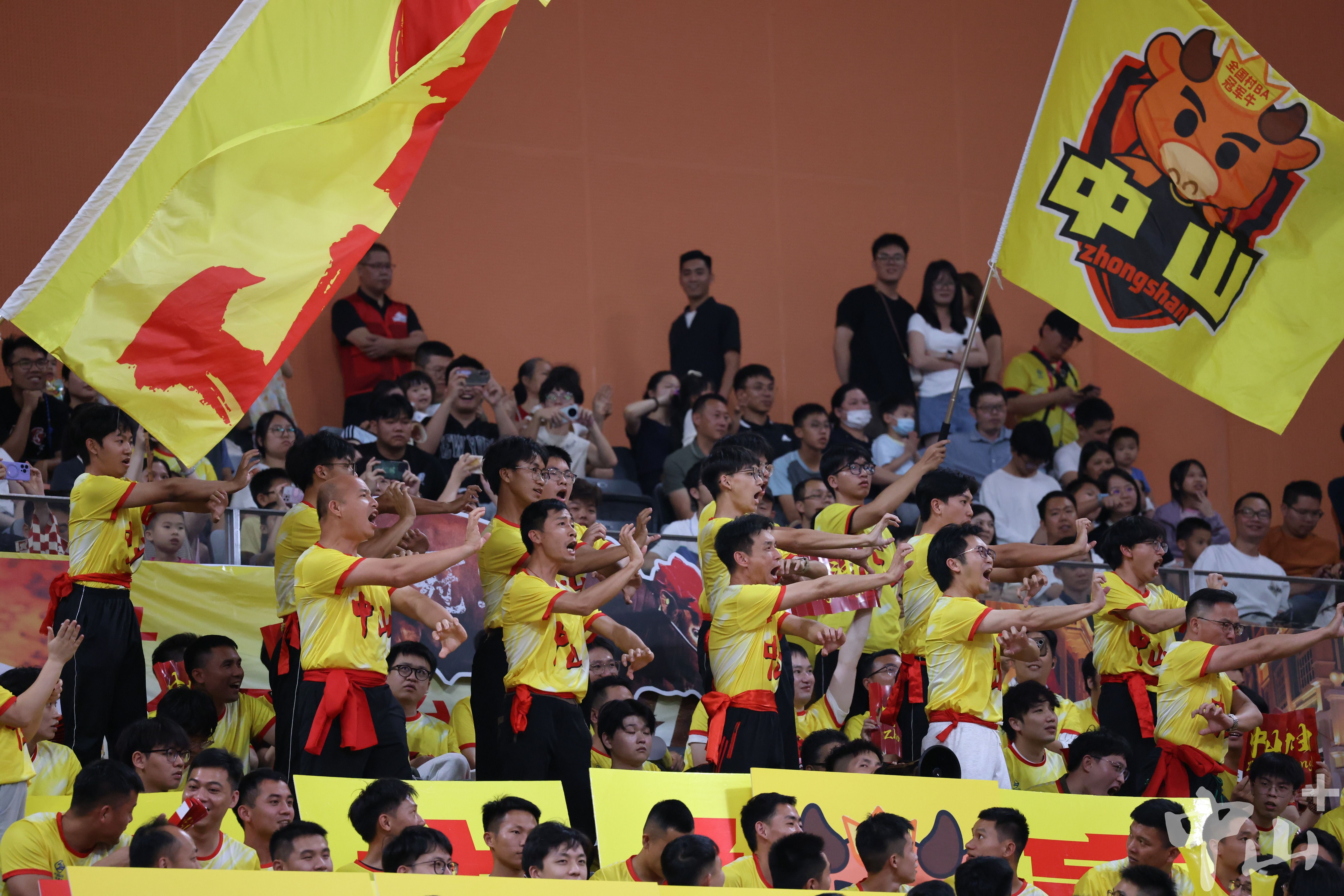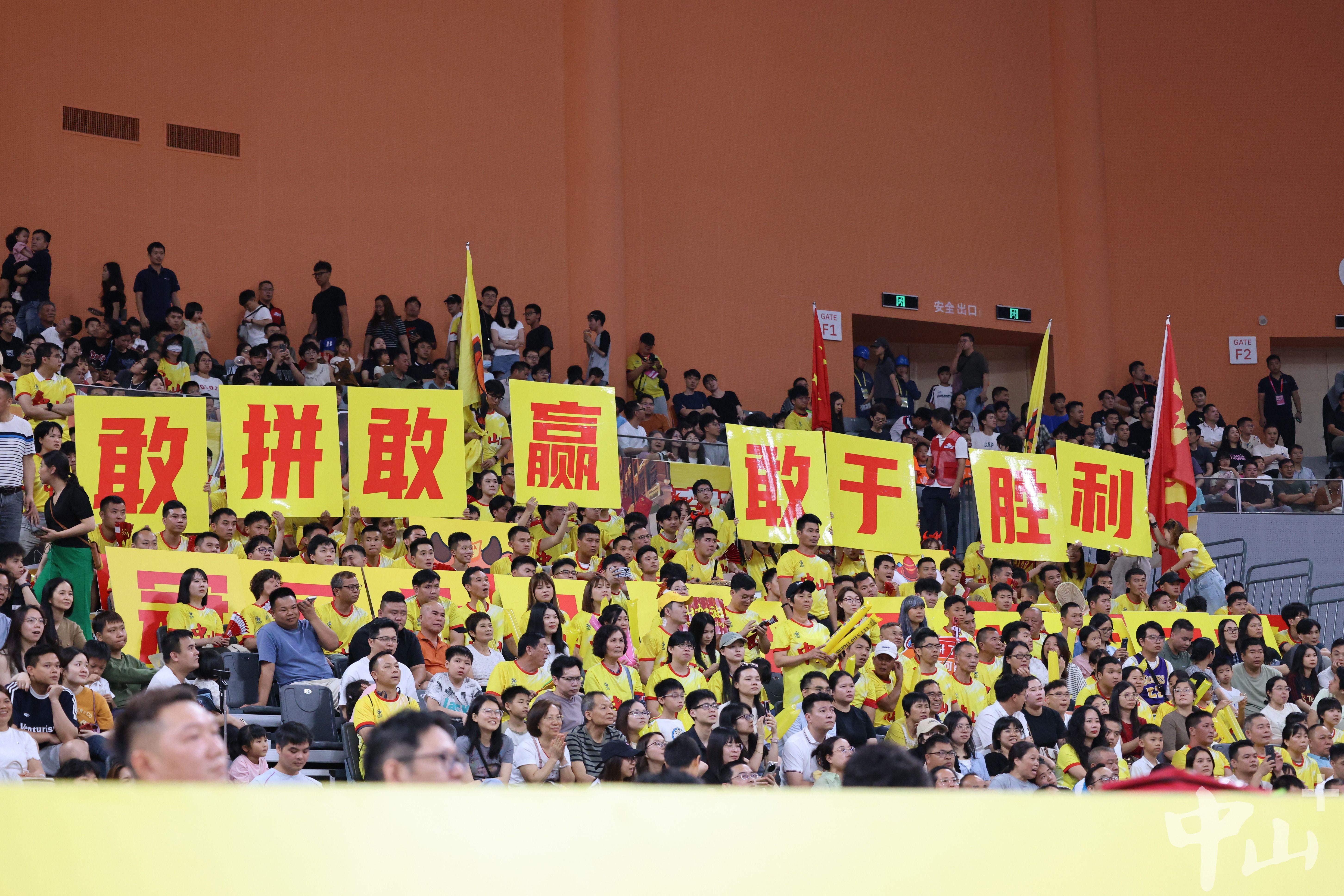 直面主場近萬名觀眾的聲浪沖擊,中山青年啦啦隊毫不怯場。約300名隊員身著統一的黃色應援T恤,手持“敢拼敢贏 敢于勝利”“佛中一家親,籃球心連心”的手牌,還齊聲高唱《男兒當自強》《團結就是力量》《歌唱祖國》等助威曲目,為場上的中山隊吶喊助威。