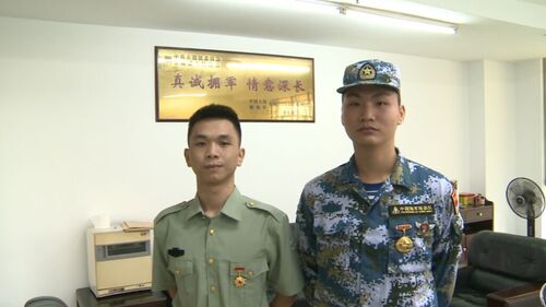 身穿綠色軍裝的叫余英維,旁邊穿迷彩服的是鄧爾康。中學的時候,他們就一起上學,2017年,高中一畢業就攜手一起報名圓了心里的軍旅夢。