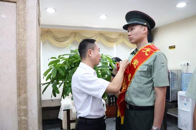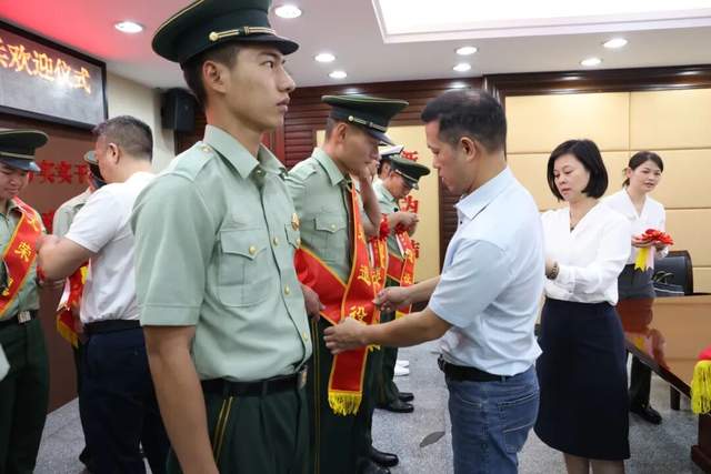 儀式現(xiàn)場,街道領(lǐng)導(dǎo)為退役士兵逐一佩戴象征榮譽的大紅花,致敬他們?yōu)閲朗聵I(yè)作出的貢獻(xiàn)。