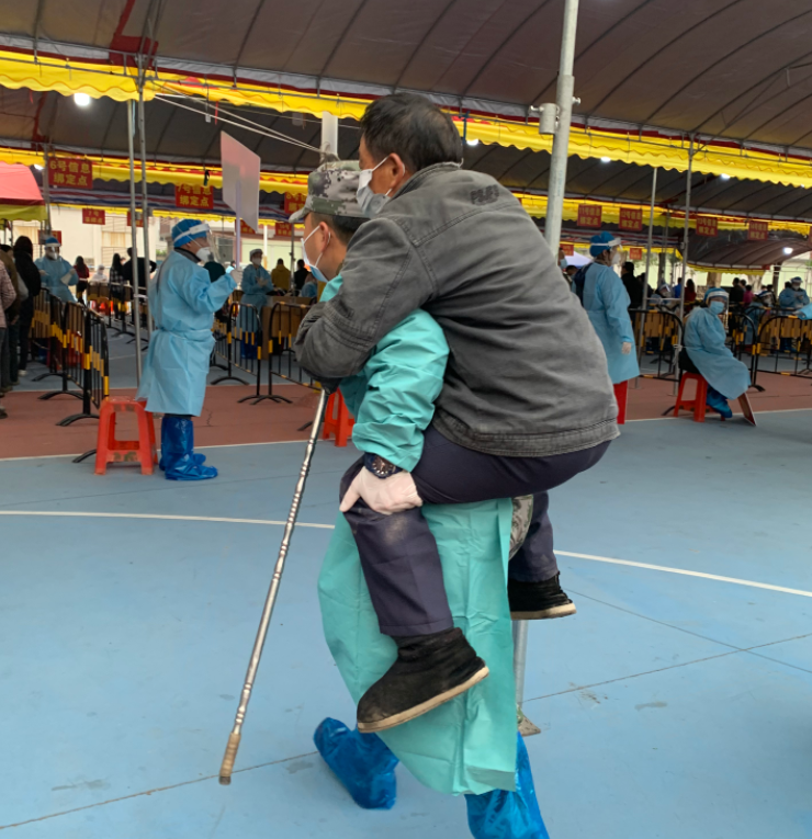 在小欖鎮(zhèn)聯(lián)豐社區(qū)核酸檢測(cè)采樣現(xiàn)場(chǎng),退役軍人吳鴻文背起一位行動(dòng)不便的老人前往核酸采樣工作臺(tái),采樣結(jié)束后,將老人送出場(chǎng)外。臨走的時(shí)候老人連聲向他道謝。 此外,民眾街道退役軍人服務(wù)中心動(dòng)員紅旗志愿服務(wù)隊(duì)退役軍人志愿者分別前往該街道18個(gè)免費(fèi)便民核酸采樣點(diǎn),助力街道開展核酸檢測(cè)工作。 |