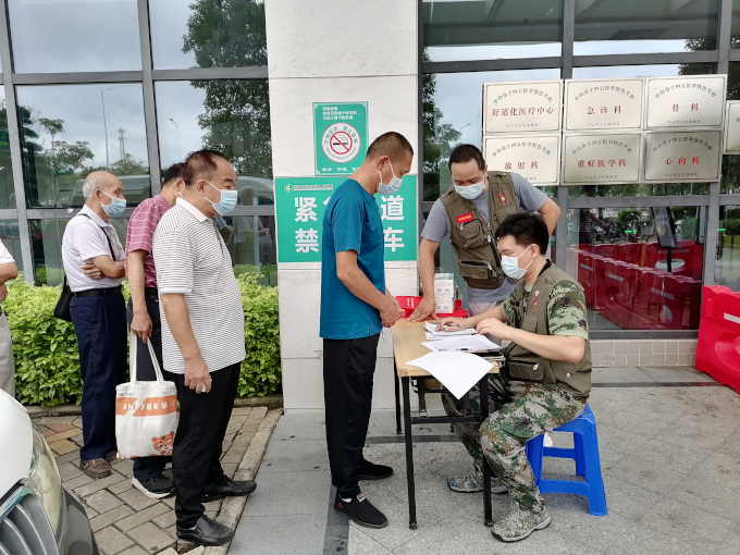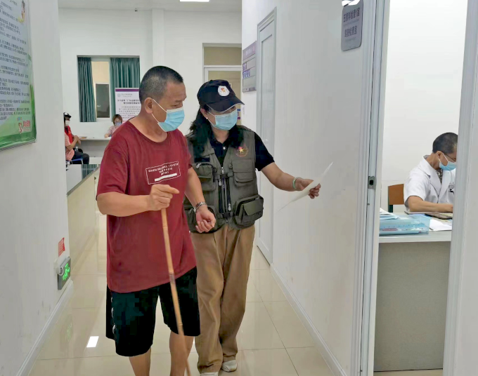 ▲坦洲鎮退役軍人服務中心工作人員和志愿者在坦洲人民醫院現場指引重點優撫對象有序進行健康體檢。