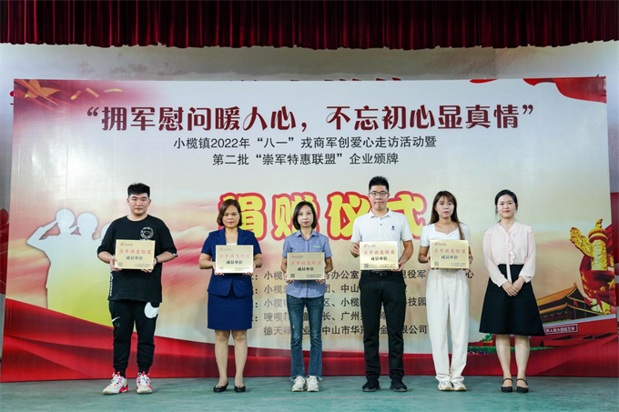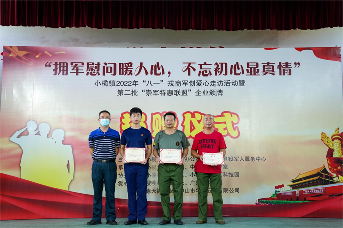 7月24日,小欖鎮舉行“擁軍慰問暖人心,不忘初心顯真情”——2022年“八一”愛心走訪活動啟動暨第二批“崇軍特惠聯盟”企業頒牌儀式。該鎮副鎮長鄧泳標、市退役軍人服務中心副主任高亞男及鎮公共服務辦、退役軍人服務中心、高沙社區、中山好人工作室相關負責人,小欖愛心助學團志愿者、愛心企業及第二批市“崇軍特惠聯盟”企業的代表以及部分優秀退役軍人代表近100人參加了活動。