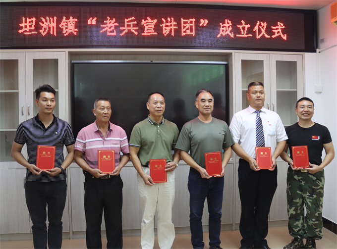 7月26日,中山市坦洲鎮成立全市鎮街首個“老兵宣講團”。中山市退役軍人事務局、中山市退役軍人服務中心,坦洲鎮公共服務辦公室、退役軍人服務中心等單位相關負責人,坦洲鎮“老兵宣講團”成員等出席成立儀式。 成立儀式現場,坦洲鎮退役軍人服務中心負責人簡要介紹了“老兵宣講團”成立的目的、任務及宣講團成員的基本情況。相關領導為“老兵宣講團”授旗,并頒發聘用證書。  ▲坦洲鎮老兵宣講團成員獲頒聘書。