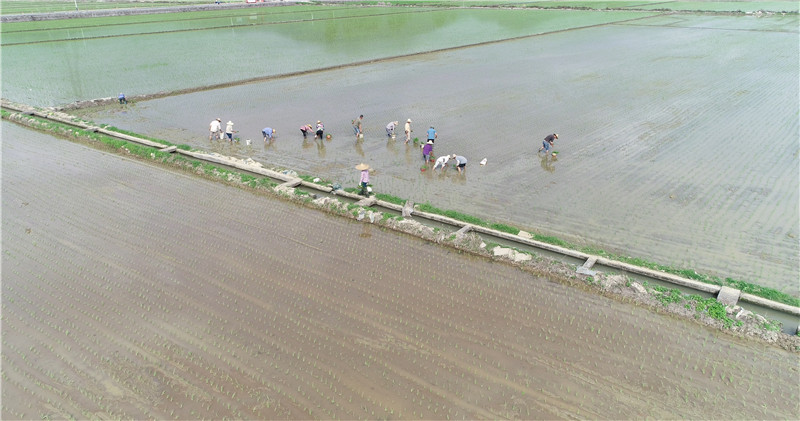 南朗鎮崖口村,2000多畝連片的稻田,放眼望去滿眼綠色。村民將秧苗運往插秧機裝載,插秧機拖著綠色的“尾巴”來回走動,留下一排排整齊的秧苗。由于種植的部分秧苗間隔較大,村民起褲腿和衣袖,戴著草帽或扎起頭巾,佝僂著腰在田中手工補種秧苗。