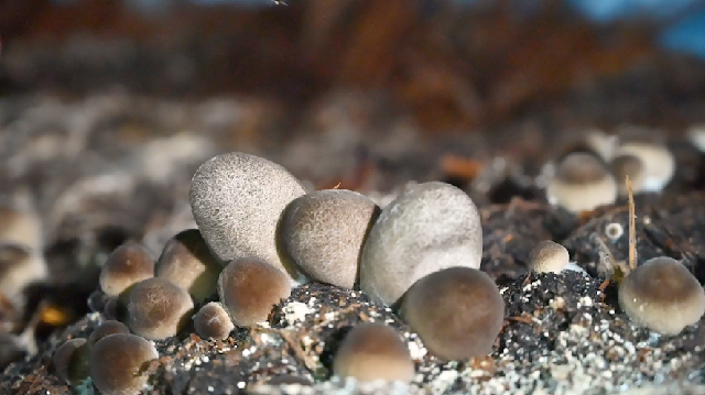 厚厚的稻草經過充分的清洗和消毒,上面鋪滿了黑色肥料,碩大的民眾草菇伸展著雪白的菌絲,茁壯成長。