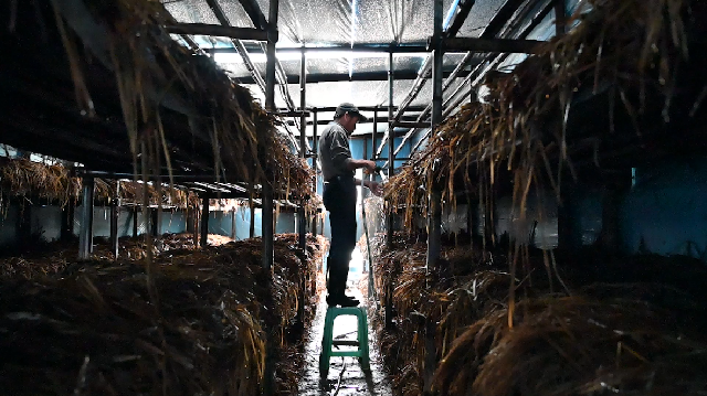 跟隨孫林輝鉆進溫室,狹窄的通道僅容一人同行。房間的溫度較室外更高,借著幾串小燈散發的微光,方能窺見木架上民眾草菇的真面目。