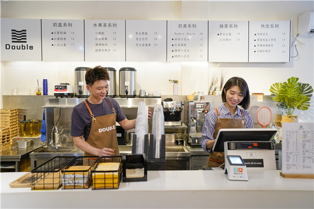走進茶飲店,現代簡約風的布置,一排銀色的高凳面向長桌,紙質的店名標識飲杯整齊地靠墻排列在桌上。店內彌漫著水果、奶制品、咖啡的混合香氣,三五顧客悠閑地坐著,聊著天、喝著飲品。茶飲店老板方世杰一邊熱情地招呼客人,一邊手法嫻熟地制作一杯珍珠奶茶,老板娘李美明在一旁恬靜地笑著……