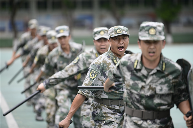 據了解,這90名民兵從第一階段集訓的188人中脫穎而出,經歷了10天的集訓后,警棍盾牌術、擒敵拳、戰場救護、輕武器射擊等科目,每一個動作都已熟記在每個民兵的心頭。隨后,為考驗受訓民兵教練員的組織指揮能力和臨場應變能力,劉燦瑩現場還隨機抽取了2名隊員進行了隊列指揮,兩人均以出色的表現完成了考驗。