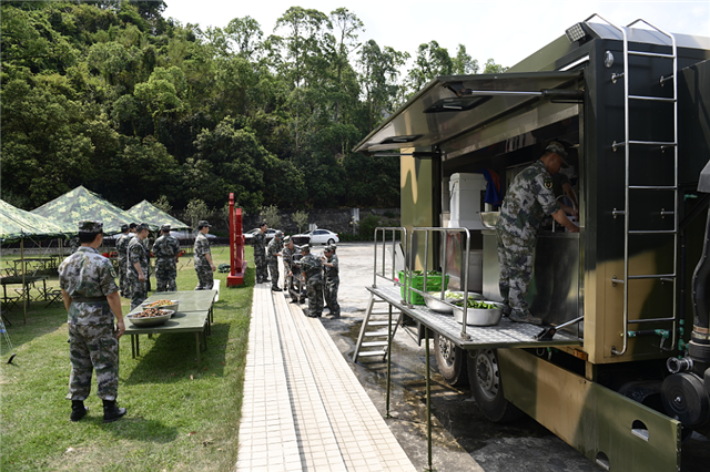 據中山軍分區戰備建設處參謀談健介紹,與往年基地保障伙食不同的是,今年的民兵教練員集訓由民兵負責飯菜。為提高民兵隊伍的野外保障能力,飲食保障排首次使用專門用于制作膳食的廂體式野戰炊事車做飯。據了解,炊事車內設有灶具、供水系統、食物儲存裝置、通風和安全防火等設施。“一展開,就是一個野外的開放式廚房,蒸飯、炒菜都是一體的。”