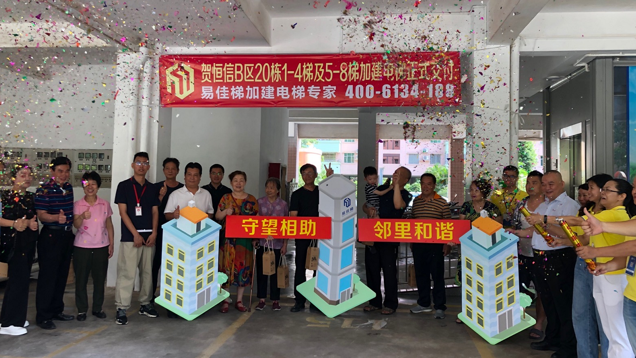 5月8日上午9點多,恒信花園B區20棟,一樓架空層處,熱鬧簡單的加裝電梯交付儀式在這里舉行,大家舉著“守望相助”“鄰里和諧”的牌子一起合影留念,最大年紀的有80多歲,現場其樂融融,還有禮物派送。