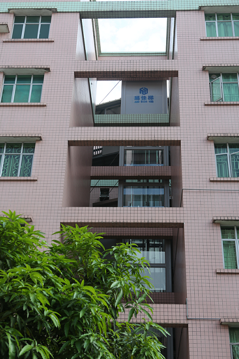 從外觀上與其他外掛電梯不同的是,這條梯從一樓架空層的樓板穿出,被兩側樓宇圍合起來,從外立面看,電梯仿佛從樓宇中“長出來”。