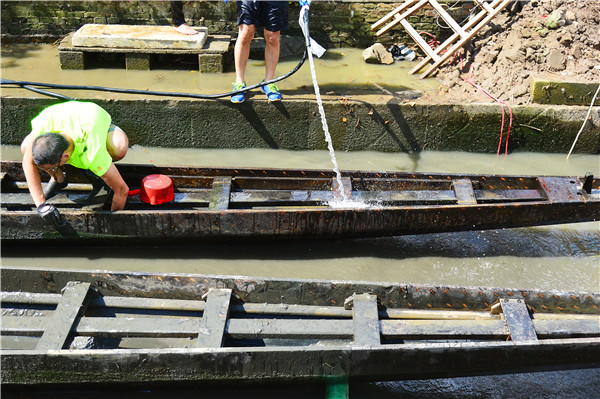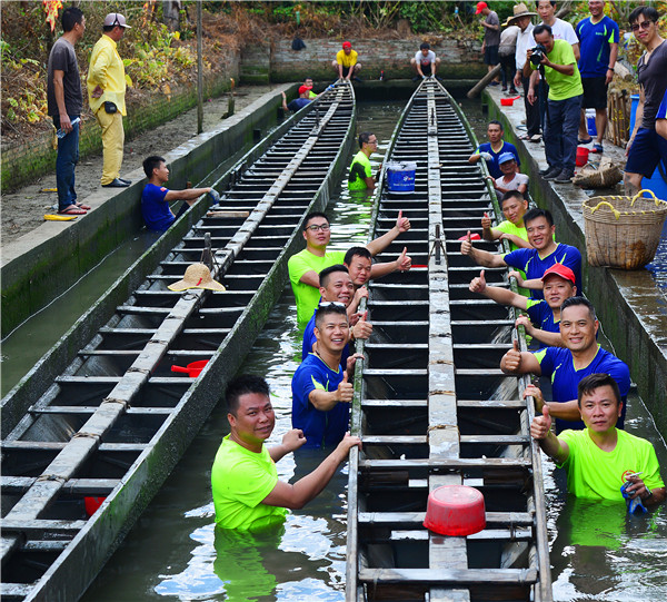 “一二三,上!”精壯的漢子們站在龍舟塢齊腰深的水中,伴隨著岸上愈加急促的鼓點,他們齊聲吶喊著,奮力將潛藏在水里的龍舟“起”到水面。