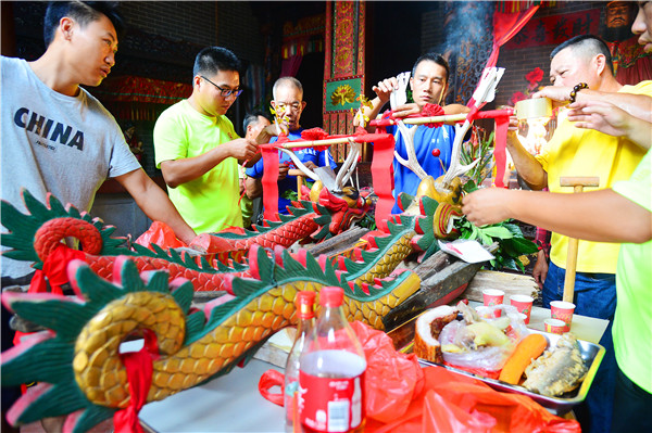 當天上午9點半,看著龍舟塢里的龍舟逐漸浮出水面,參與“起龍舟”儀式的李果也笑逐顏開。今年69歲的他是土生土長的石岐街道基邊村人,改革開放以后,李果就成為了一名“石岐扒仔”,“我們基邊村在1982年的賽龍舟拿到過第一名,2005年的時候是第二名。”數著過往的成績,李果頗為自豪。在他看來,賽龍舟不僅是一項體育競技項目,也是吉祥的象征,出海訓練時,遇見龍舟的民船都會放幾串鞭炮,祈求平安、逢兇化吉,而“扒仔”們也會敲三通鼓作為回應。“‘起龍舟’以后,我們會將它晾干,打磨、上油再裝上龍頭,就可以參加賽龍舟了。大家都說,舉行賽龍舟的地方才會快速發展、人丁興旺。”李果告訴記者。