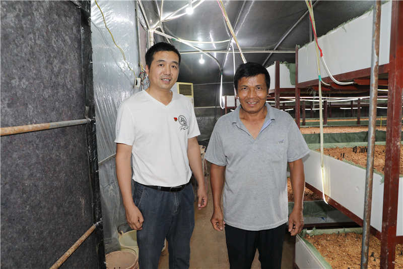 ▲中山市委政法委駐河村工作隊隊長朱代榮(左)與脫貧戶趙季南(右)在蘑菇大棚里。