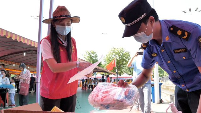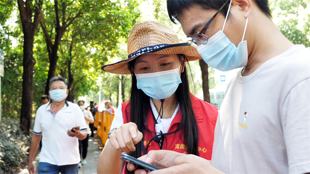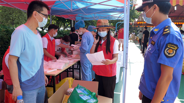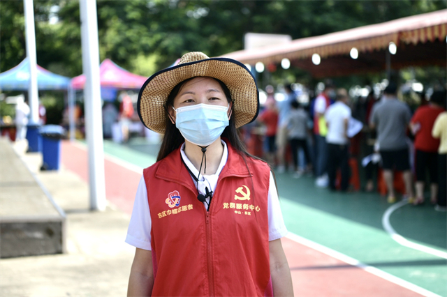 當天上午,紫馬嶺南門采樣點雖然人流不時出現小高峰,但由于開了12條線,采樣快,群眾一致反映速度很快。胡銀波作為現場總統籌,經常走著走著就是一路小跑,記者一不留神,就不見了她的身影:“用眼睛發現哪里不順暢人我就去哪里,哪里有問題我就到哪里。”統計盒飯數量找她,風扇、冰桶、充電寶等物資不夠找她,安撫現場因為天熱情緒波動的群眾、哭鬧著不肯張開嘴巴的嬰孩,幫助沒有葵花碼的老人,搬物資、撿垃圾、人流高峰時協調排隊 ……胡銀波匆匆地往前走,一路發現問題、解決問題,天氣炎熱,她被汗浸濕的發絲粘在額角。