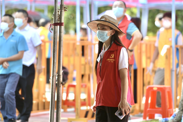 胡銀波帶著帽子、戴著口罩、穿著紅馬甲穿梭在人群中。雖然頭一晚忙得只瞇兩個小時,但她依然精神抖擻,不停地接著電話,有時候還要小跑幾步。7月22日下午兩點接到通知可能要進行全員核酸采樣后,新鰲嶺社區就開始著手準備。通過聯系團市委青志協、下沉機關部門、東區街道黨政辦、城住農、社區黨群服務中心、經聯社、物業小區、業委會、黨支部、社會志愿者……很快,約240人的核酸采樣服務隊伍就位。