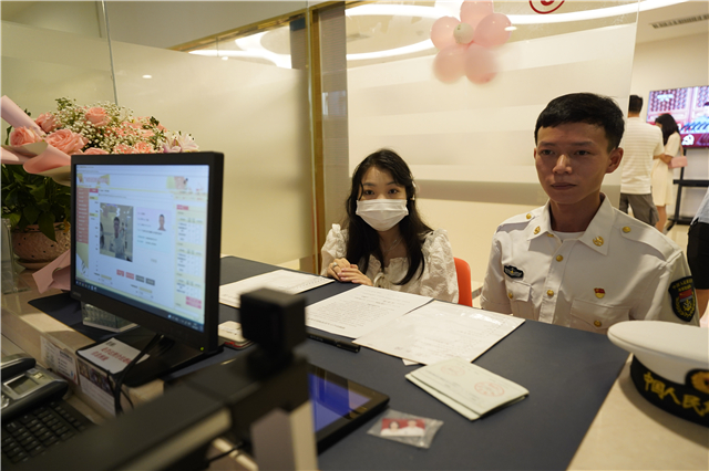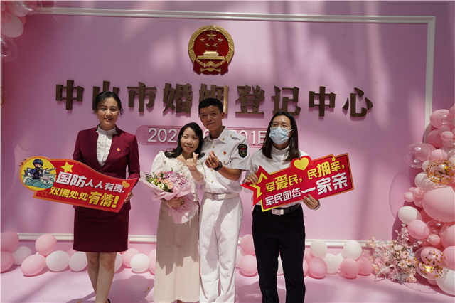 來自古鎮(zhèn)鎮(zhèn)六坊村侯偉從小就有一個從軍夢。大學(xué)畢業(yè)后順利參軍并在南海艦隊海軍陸戰(zhàn)隊某旅服役。2017年退役后,先后在古鎮(zhèn)鎮(zhèn)政府、六坊村工作,如今從事基層的征兵工作。8月1日是建軍節(jié),他特地穿上軍裝來到現(xiàn)場,與相識17年、相戀4年的區(qū)小姐領(lǐng)證結(jié)婚。區(qū)小姐幸福地說,侯偉從初中開始就是班長,在她眼中就是一個“自帶光環(huán)”的鄰家男孩。參軍服役后回到古鎮(zhèn),侯偉的皮膚黝黑了,性格更加踏實沉穩(wěn),身上的“書生氣”沒有了。一次同學(xué)聚會上,二人確認(rèn)了戀人的關(guān)系。感情趨于穩(wěn)定后,二人選擇在這一特殊意義的一天領(lǐng)證。