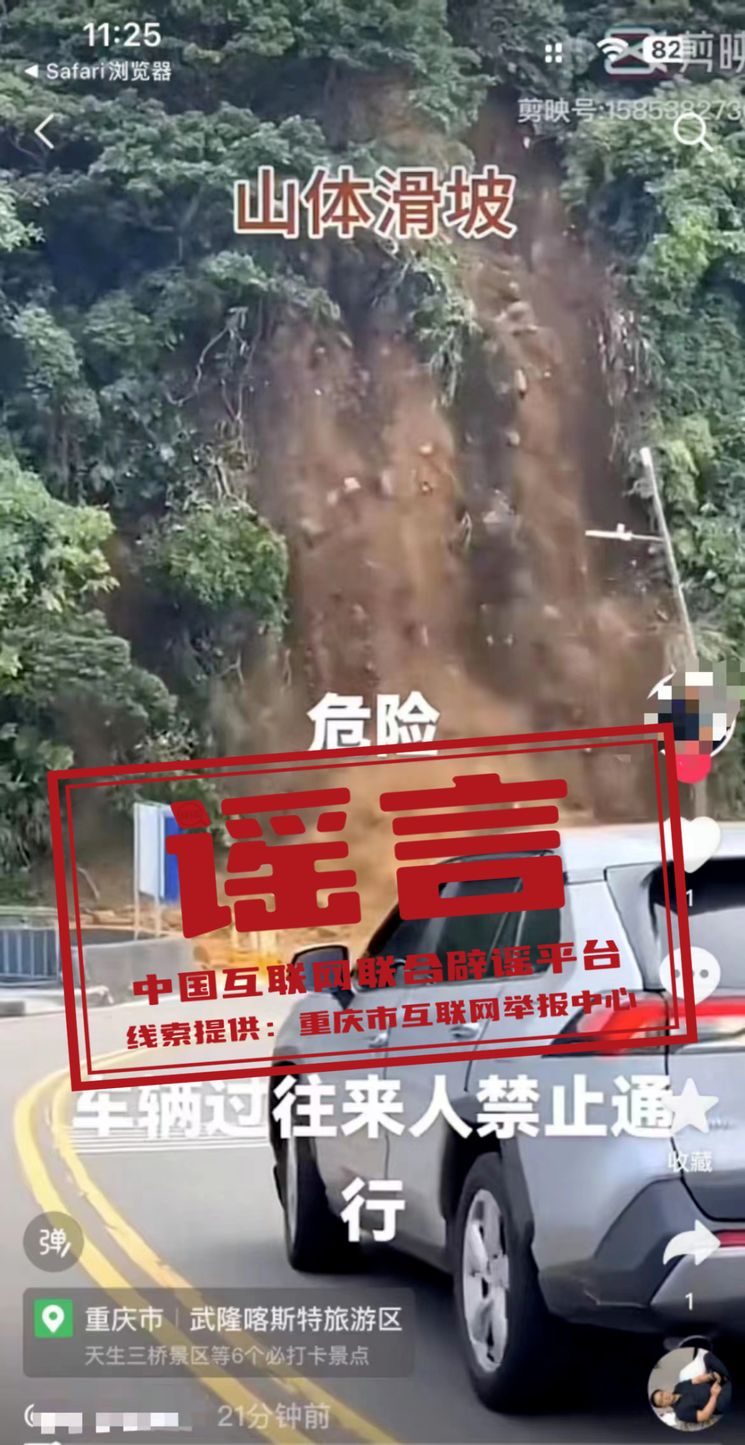 真相:近日,有網民發布了一則“山體滑坡危險,過往車輛行人禁止通行”的視頻,視頻定位標注為“重慶市武隆喀斯特旅游區”。經重慶市武隆區多部門核實,該區近期未發生大面積山體滑坡事件。網傳視頻實為2024年6月3日臺灣省基隆市中正區潮境公園入口發生的大規模山體滑坡事件,而視頻中所標注的定位信息系網民發布視頻的地點,而非事件發生的地點。(來源:“重慶辟謠”微信公眾號、網信武隆)