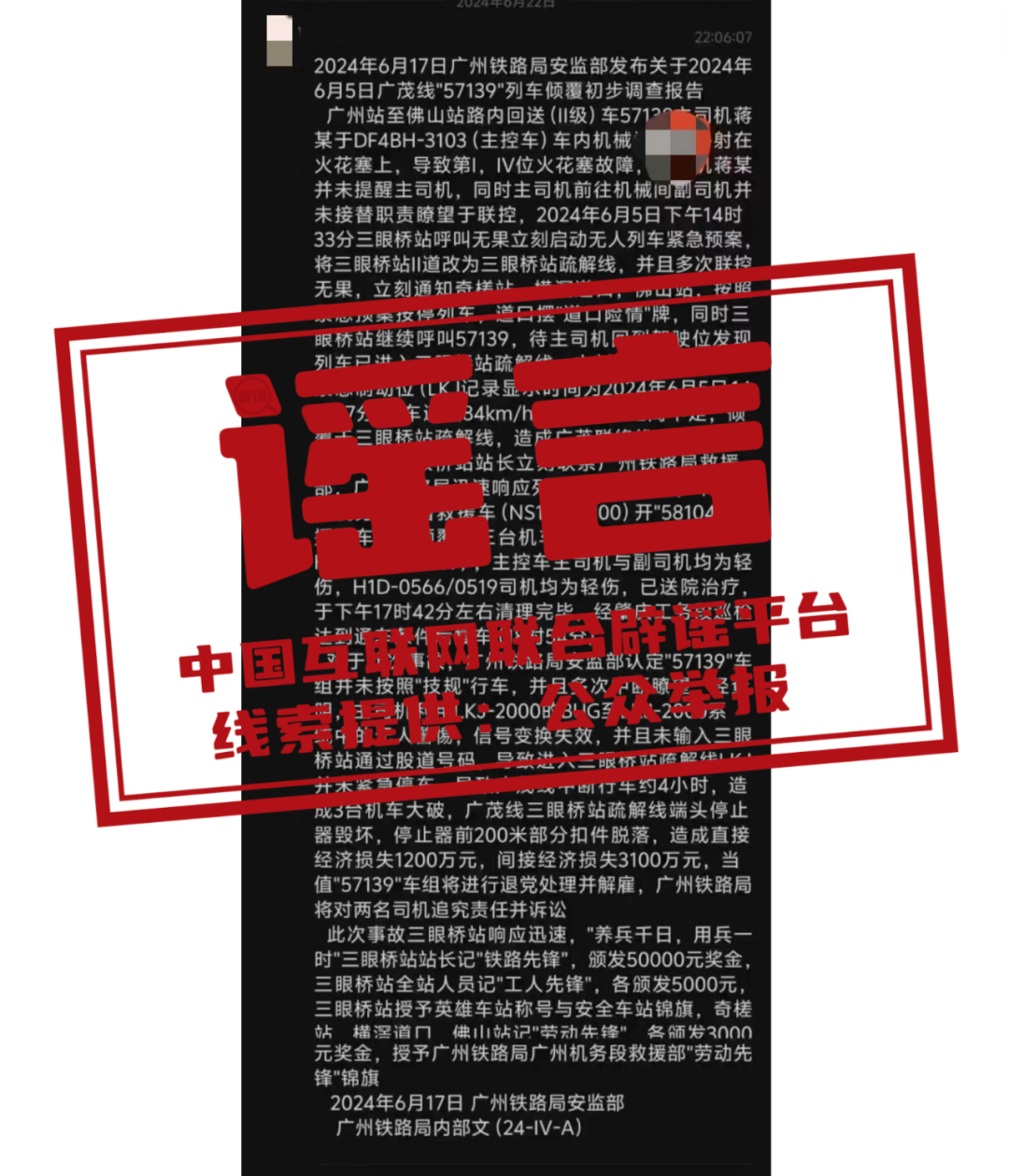 辟 謠 網傳“廣州鐵路局安監部2024年6月5日廣茂線57139列車傾覆初步調查報告”為虛假信息
