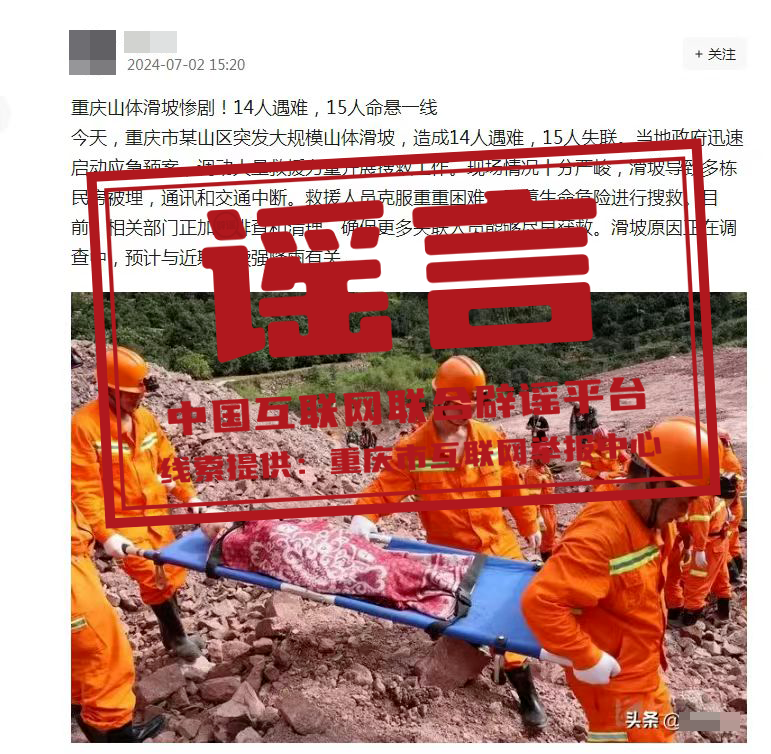真相:7月2日,某網民發布信息稱,“重慶市某山區突發大規模山體滑坡,造成14人遇難,15人失聯。”經相關部門核實,重慶近日未發生相關地質災害,網傳信息系謠言。(來源:重慶辟謠)