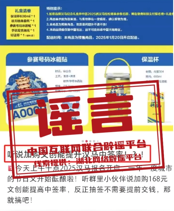 真相:近日,2025年武漢馬拉松報名通道正式開啟。在社交媒體上,有網民稱“加購168元的文創套餐可以提高中簽率”,引發關注。對此,武漢馬拉松賽事主辦方官方工作人員表示,“購買文創套餐不能提高中簽率,此類信息純屬小道消息,一切以官方公告為準。”(來源:“湖北網絡辟謠”微信公眾號、@長江云新聞)